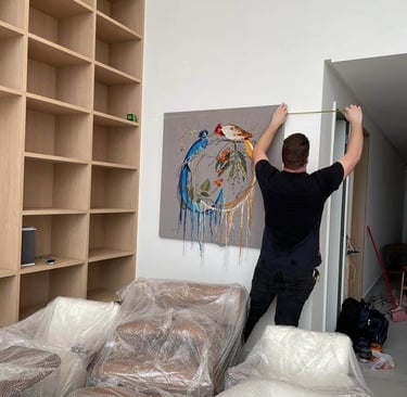 Realizo a instalação de obras de arte em clientes particulares. Sou qualificado para garantir a perfeição na colocação.